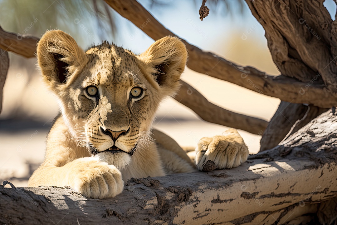 Filhote de leão com juba marrom-avermelhada descansando sob a árvor...
