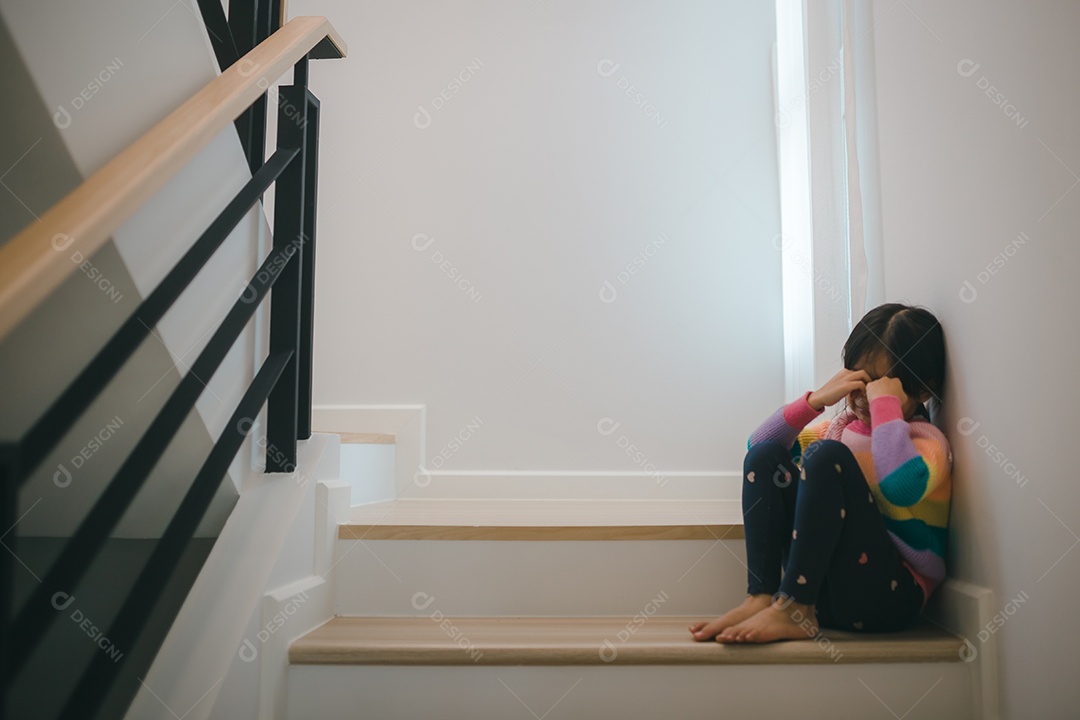 Criança triste deste pai e mãe discutindo, conceito negativo de família. meninas sentadas e chorando na escada.