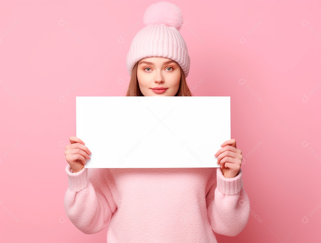 Linda mulher usando roupa de inverno,segurando cartaz em branco sobre fundo rosa.