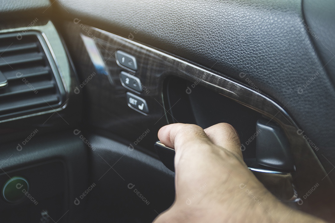 O homem do motorista está abrindo a maçaneta da porta do carro em um carro