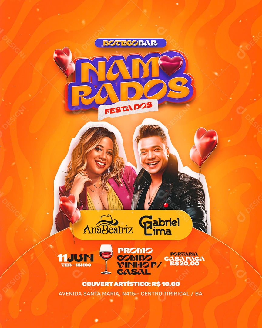 Flyer Boteco Bar Festa dos Namorados Ana Beatriz Gabriel Lima Social Media PSD Editável