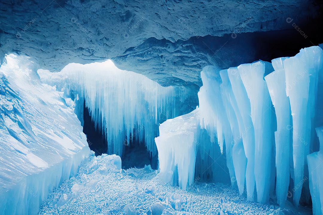 Uma bela paisagem dentro de uma grande caverna de gelo sob uma gele...