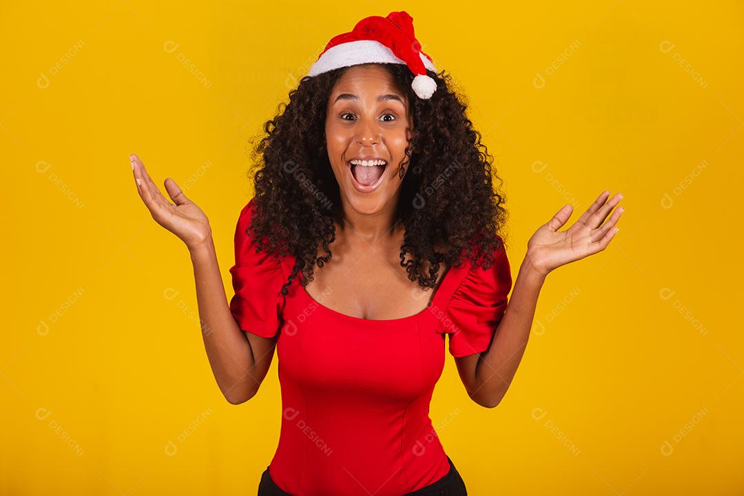 linda mulher afro em gratidão por entregar no coração com chapéu de Papai Noel