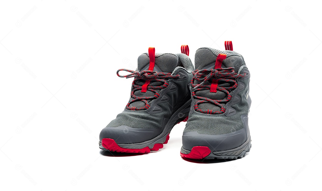 Homens trekking sapatos isolados no fundo branco. caminhada cinza-avermelhada