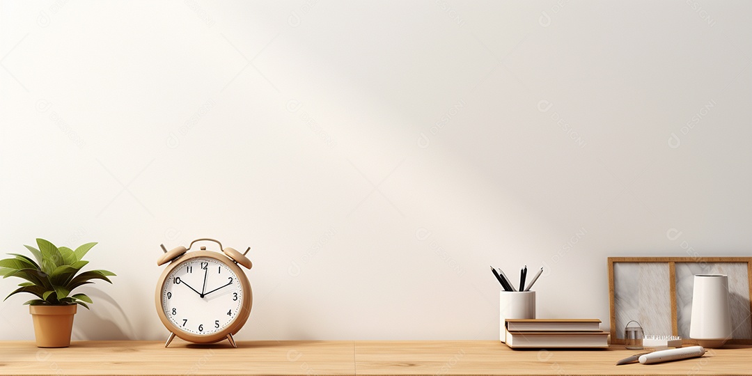 Desktop de madeira com despertador e bloco de notas em uma sala branca