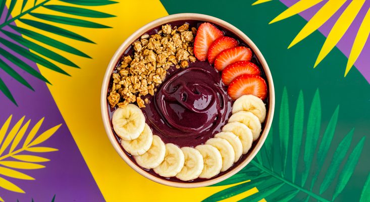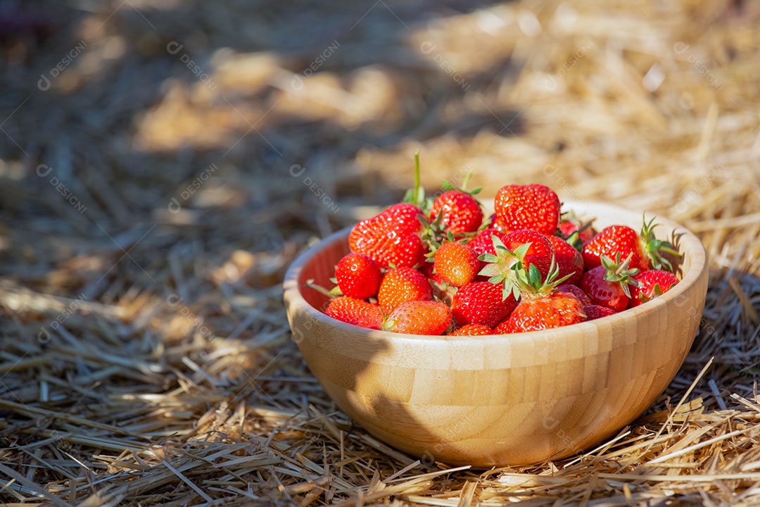 Morangos em uma tigela de madeira colocados no jardim de frutas.