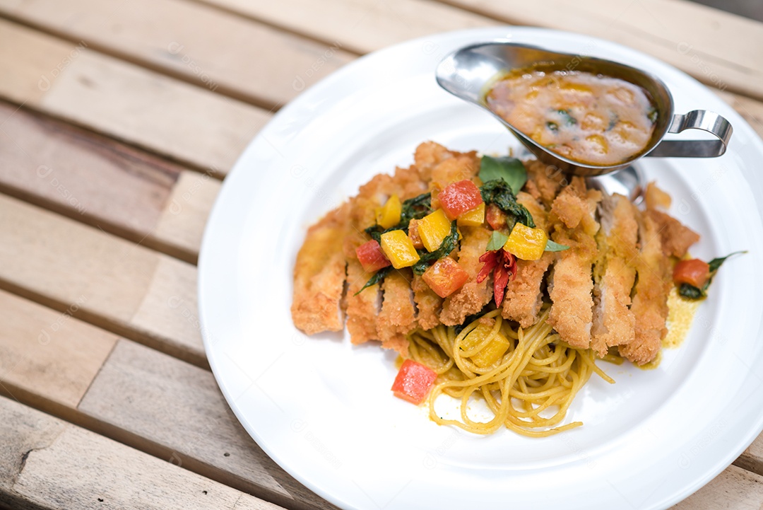 Mãos de pessoa colocando macarronada sobre prato branco mesa madeira