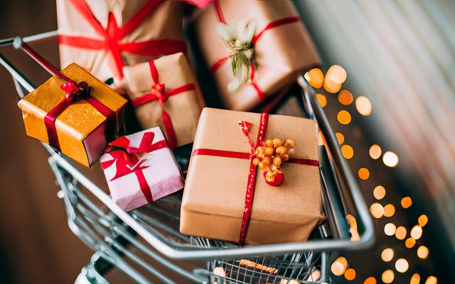 Carrinho de compras com caixas de presente no laptop para o conceit...