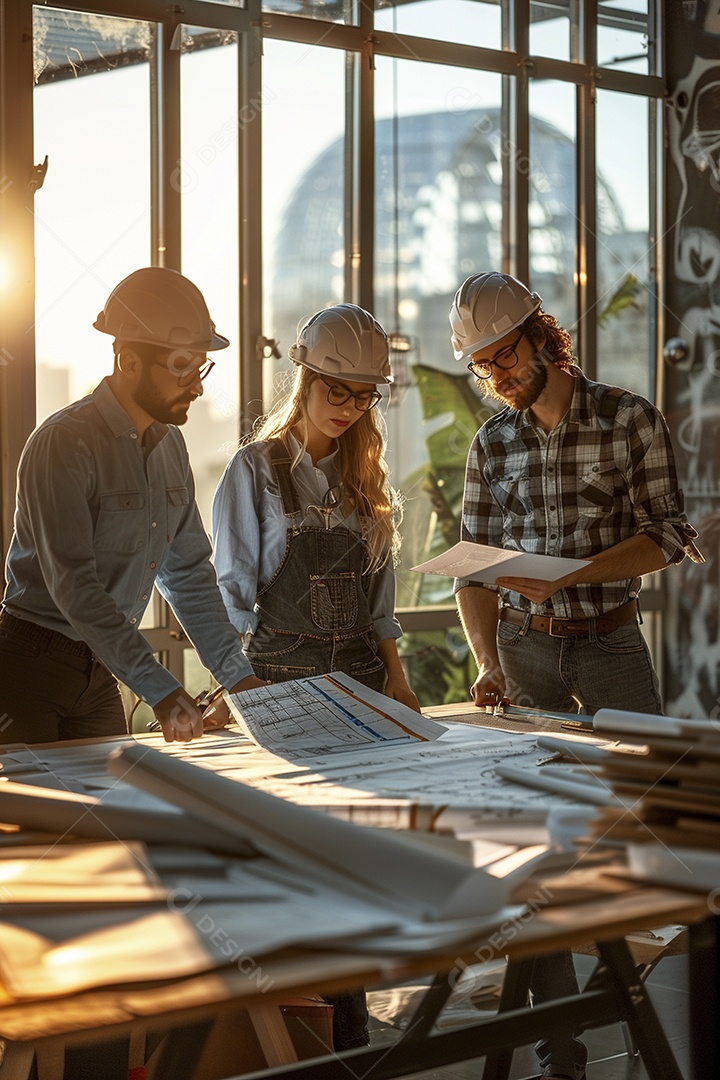 Equipe de engenheiros engajados, trabalhando em torno de uma mesa de conferência com plantas
