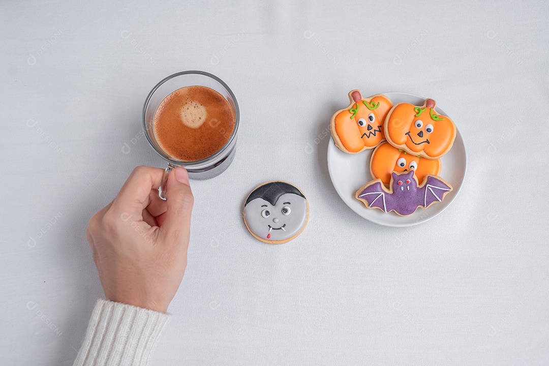 Mão de uma mulher segurando a xícara de café durante comer biscoitos engraçados de Halloween. Feliz dia de Halloween, truque ou ameaça, Olá outubro, outono outono, tradicional, festa e conceito de férias