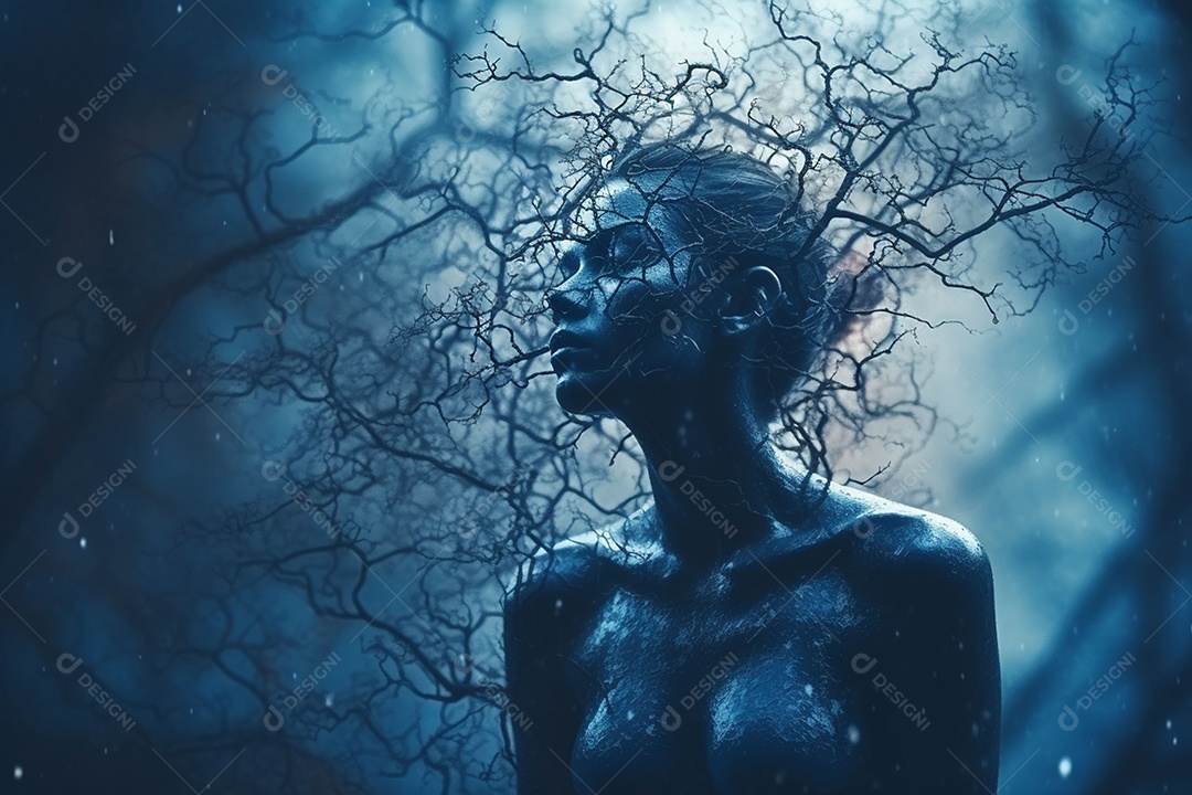 Conceito de transtorno de saúde mental. Mulher deprimida exausta tocando a testa. Foto de silhueta de mulher estressada combinada com aquarela.