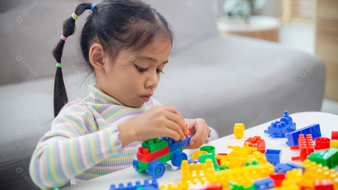 Adorável menina jogando blocos de brinquedo em uma sala iluminada