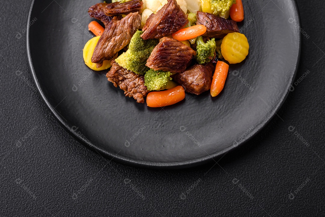 Deliciosas cenouras frescas de carne e legumes, brócolis, couve-flor em uma placa preta sobre um fundo escuro de concreto