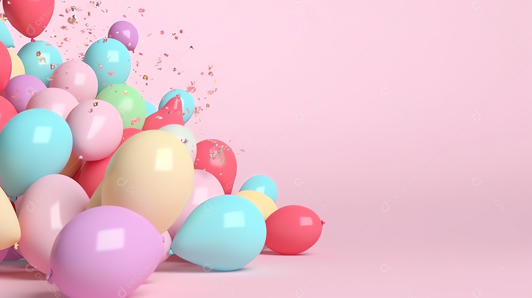 Balões coloridos brilhantes com confetes para celebração de festa em fundo pastel com espaço de cópia
