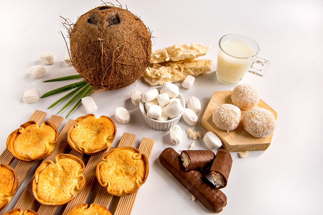 Delícias de coco em um fundo branco, receitas de doces de coco