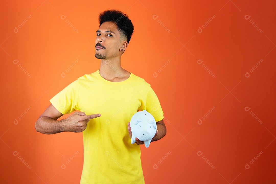 Homem negro segurando e apontando para o cofrinho isolado na laranja.