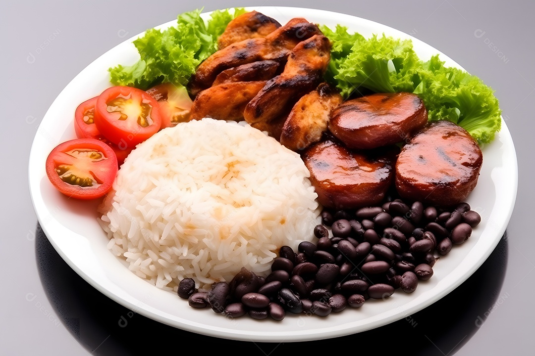Prato de comida arroz salada carne e molho sobre uma mesa de restau...