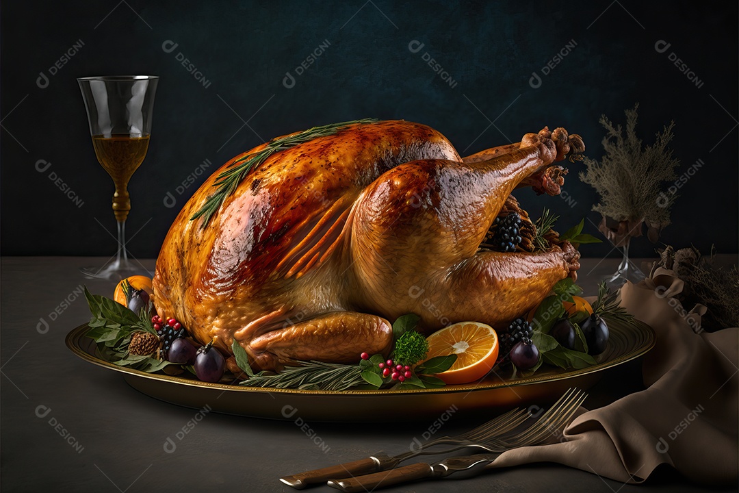 Peru assado suculento e saboroso no prato com decoração de Natal.