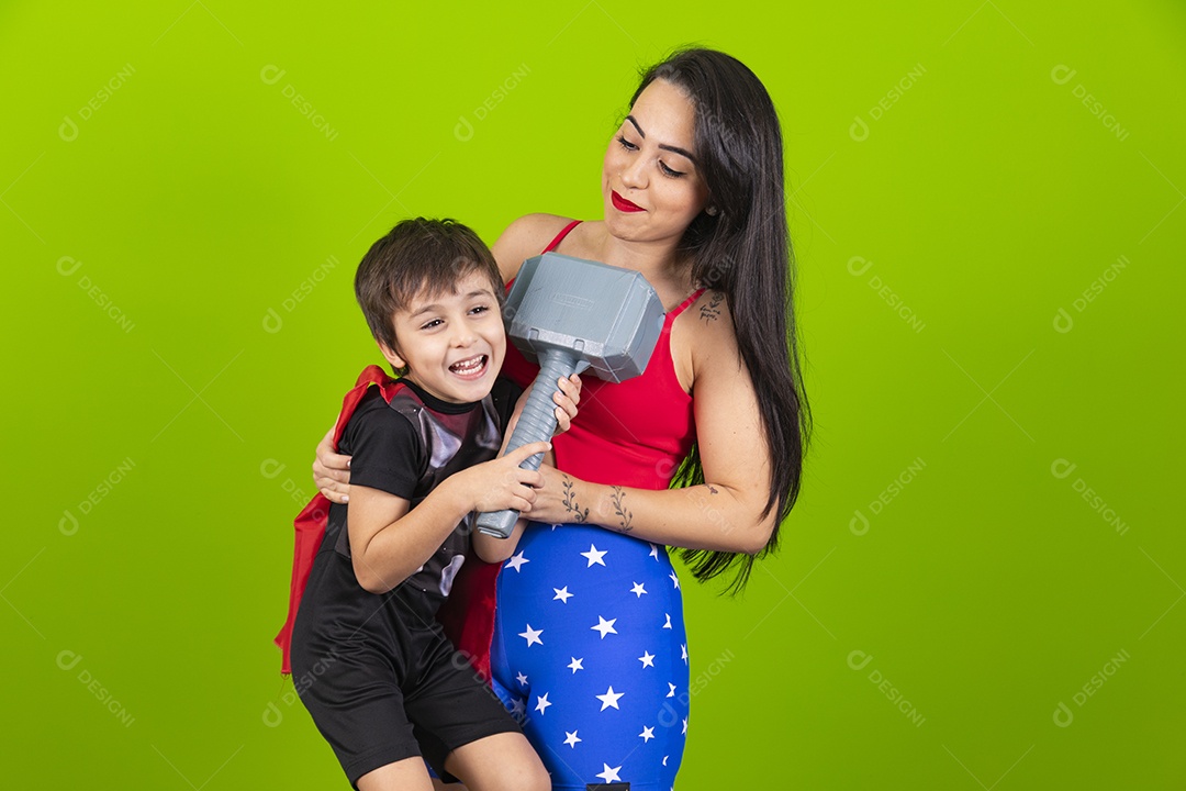 Mãe e filho fantasiados de super herói sobre fundo isolado