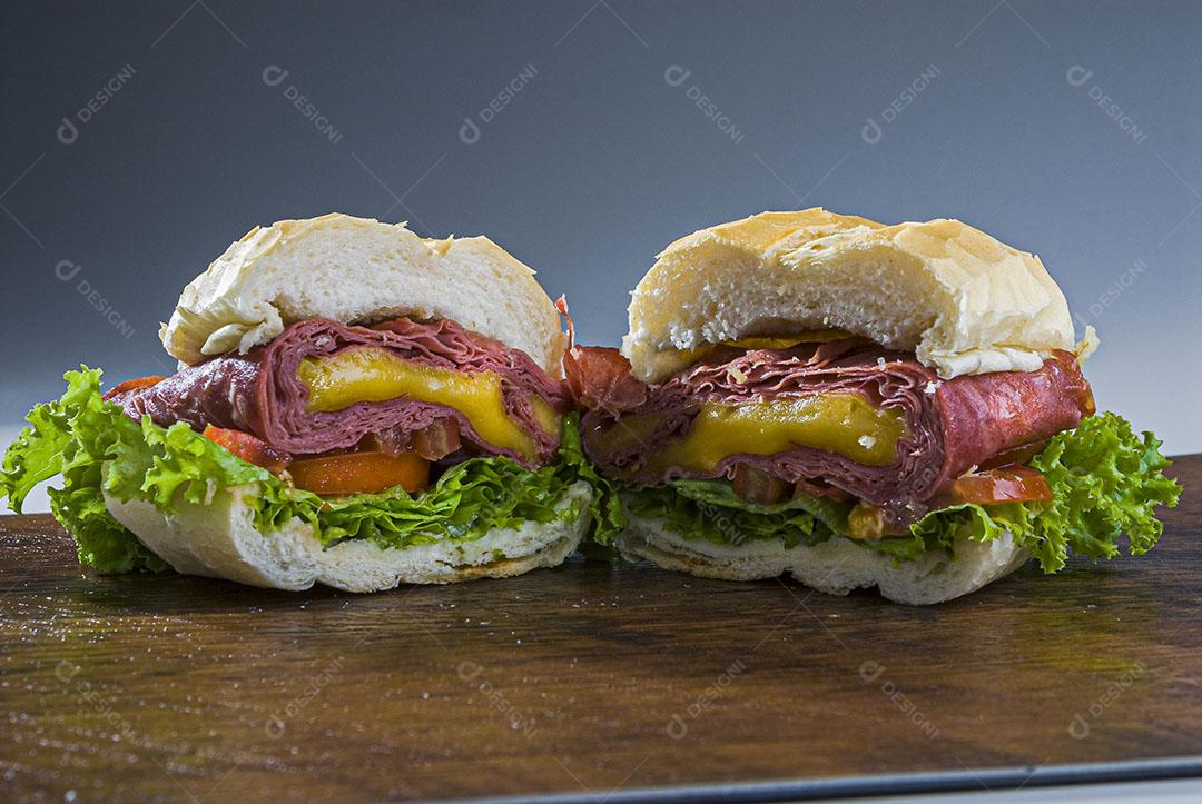 Sanduiche De Mortadela Com Queijo Derretido E Alface No Pão Imagem JPG
