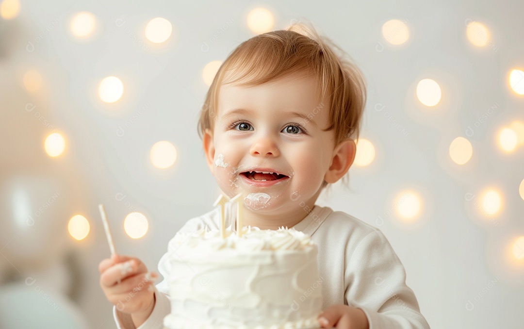 Lindo menino sorridente segurando uma criança de bolo de aniversário