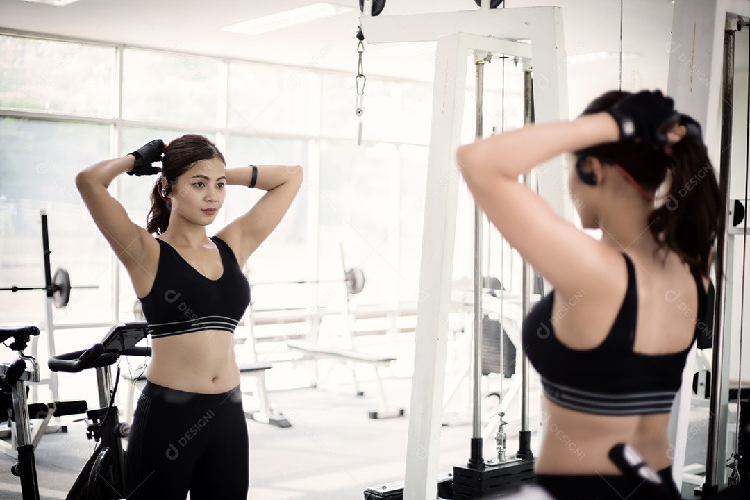Mulher atlética asiática se aquecendo e jovem atleta sentada em um exercício e alongamento em uma academia, conceito de estilo de vida saudável, foco suave