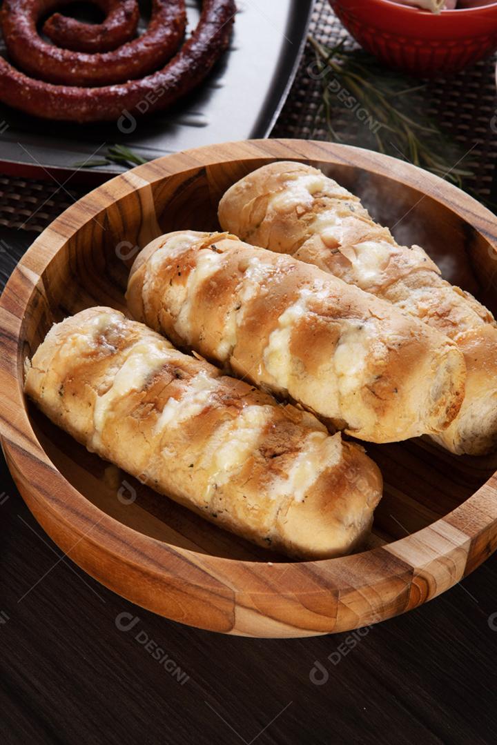 Pão de alho em um prato vermelho na mesa de churrasco com salsicha,
