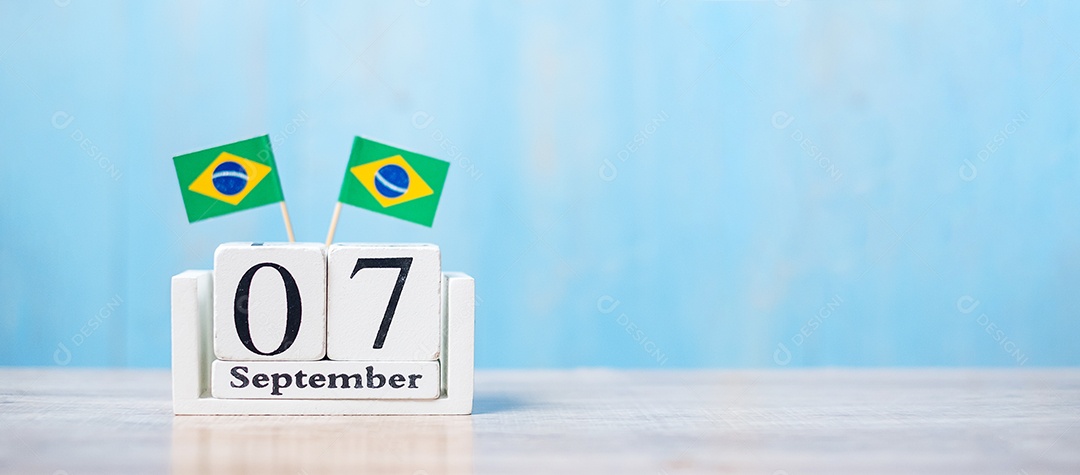 Calendário de madeira de 7 de setembro com bandeiras do Brasil em miniatura. Dia da independência do Brasil e conceitos de celebração feliz