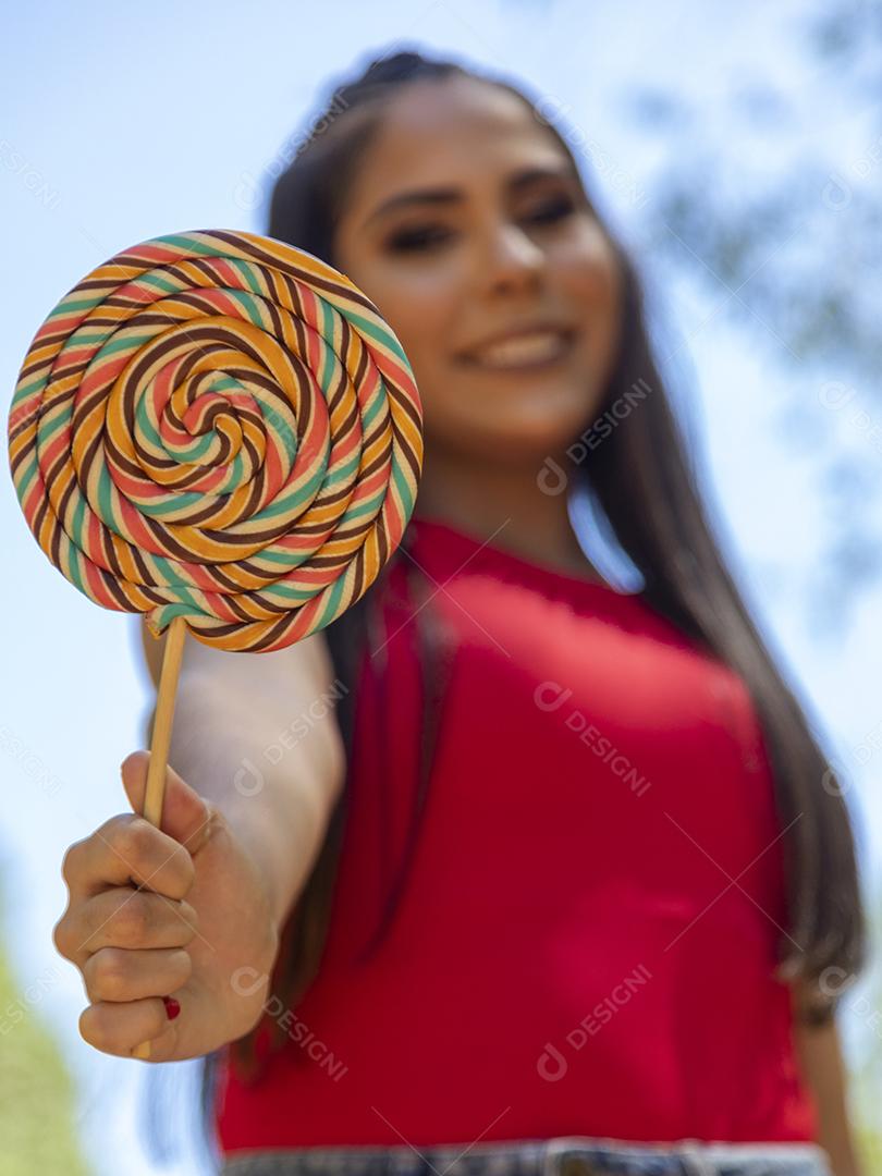 Linda menina morena segurando pirulito colorido na floresta
