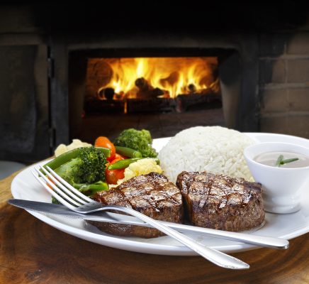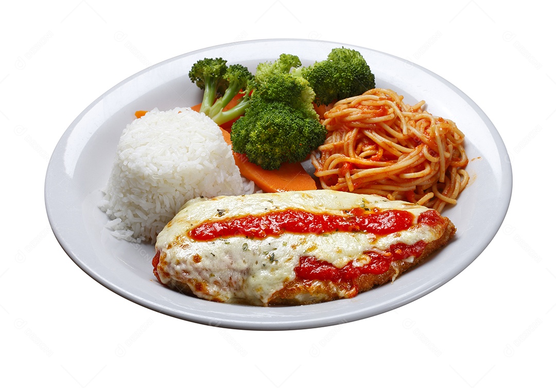Arroz com salada macarrão e bifé a parmegiana