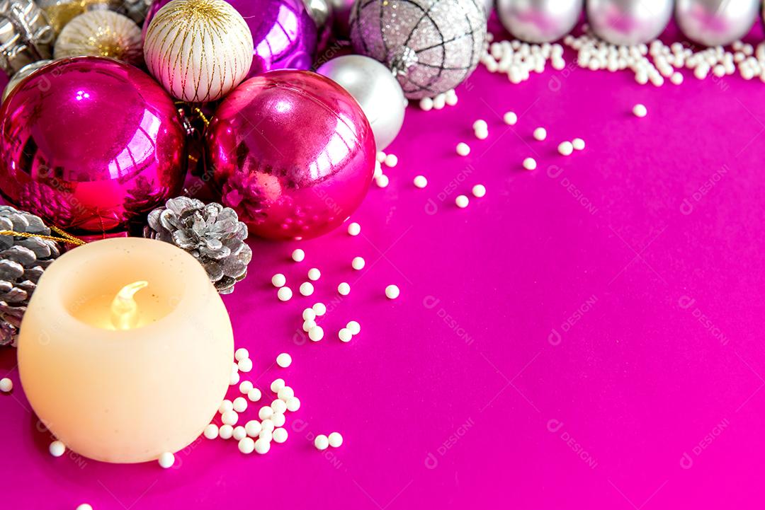 Bolas de natal e enfeites em um fundo rosa
