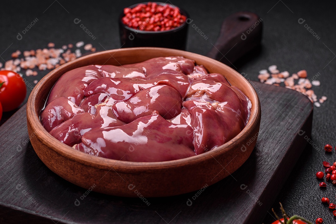 Frango cru fresco ou fígado de peru em uma placa cerâmica com sal, especiarias e ervas sobre um fundo escuro de concreto