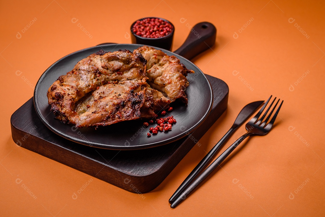 Delicioso frango crocante fresco grelhado com sal, especiarias e ervas. Prato de carne grelhada