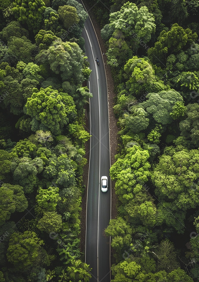 Vista aérea do carro viaja pela estrada tranquila da floresta