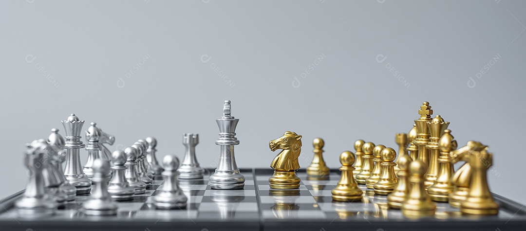 Figura do rei do xadrez de ouro no tabuleiro de xadrez contra oponente ou inimigo.