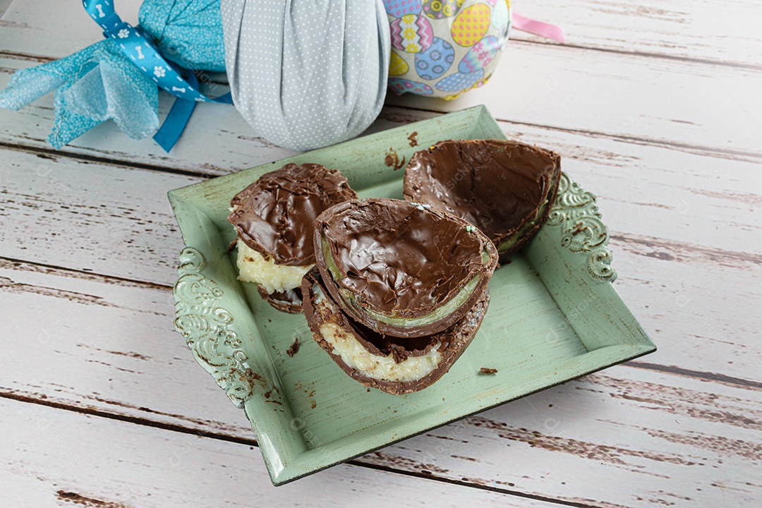 Duas metades de ovos de Páscoa de chocolate recheados com brigadeiro branco