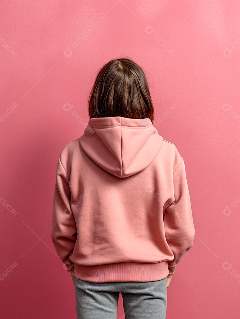 Pessoa de costas usando moletom sobre um fundo isolado rosa.