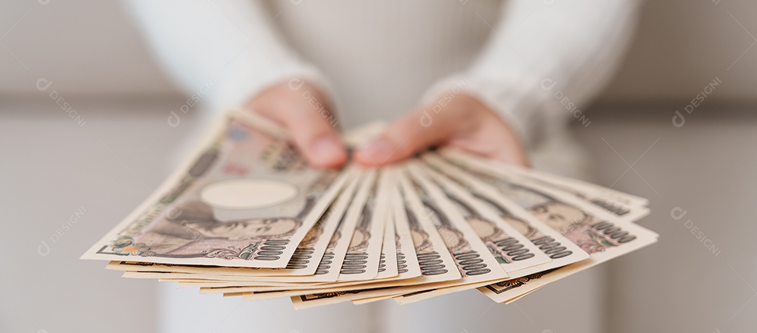 Mão de uma mulher segurando a pilha de notas de ienes japoneses.