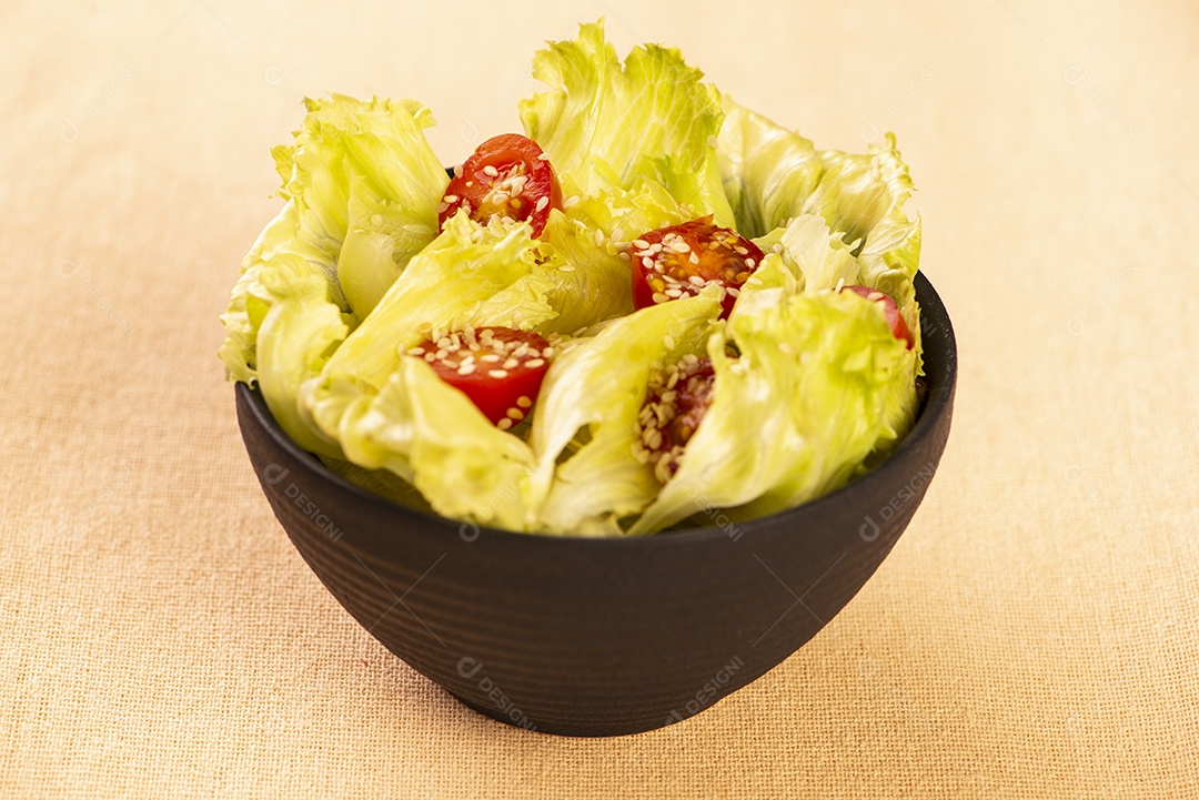Tigela preta com salada de alface e tomate cereja e gergelim branco
