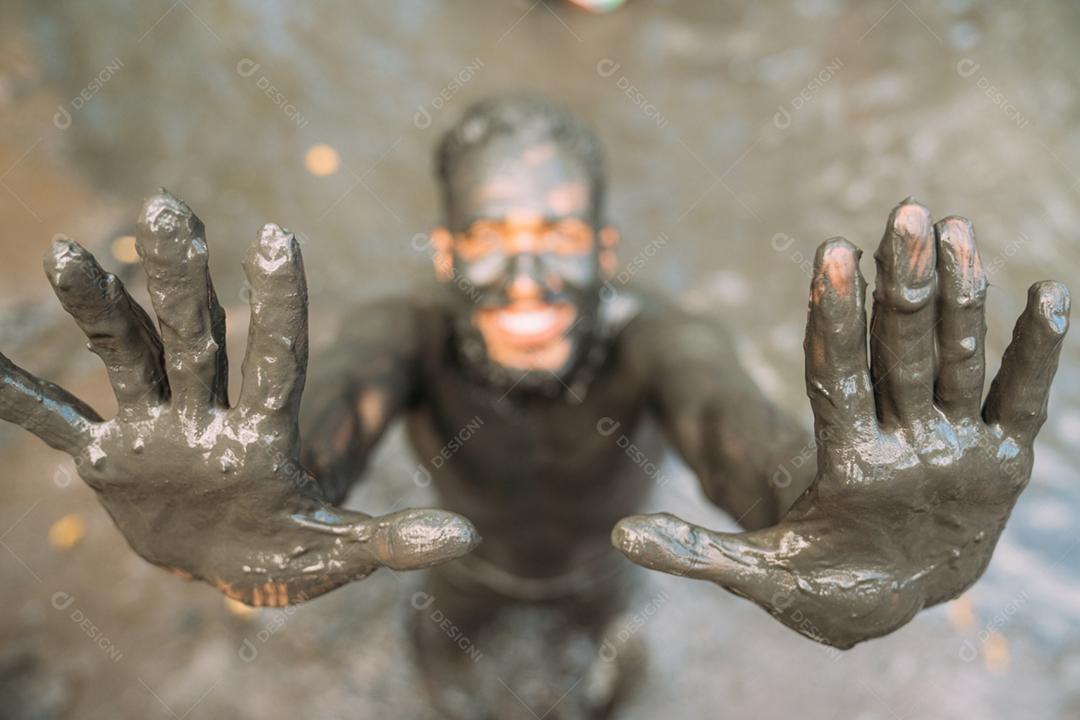 Sorridente jovem latino-americano fazendo tratamento de argila verd...