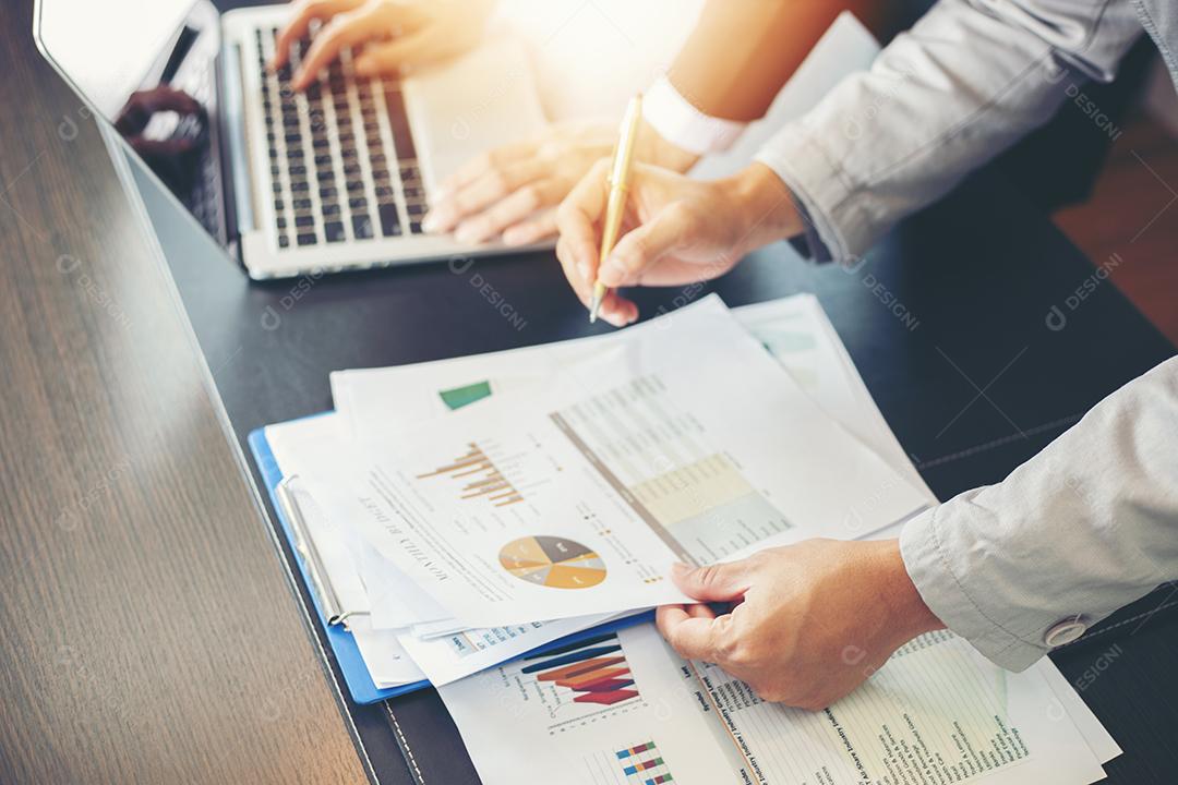 Empresárias asiáticas segurando uma caneta e documentos de análise na mesa de escritório com computador portátil e diagrama financeiro gráfico trabalhando em segundo plano