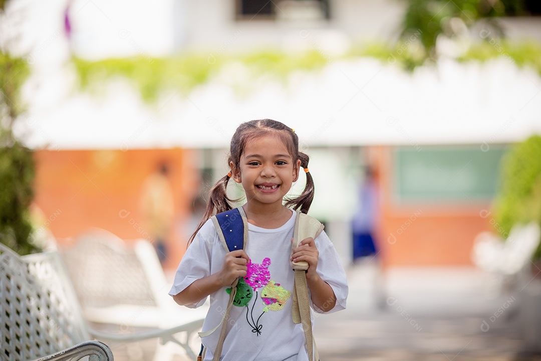 De volta à escola. Menina asiática lendo um livro. Alunos do ensino...