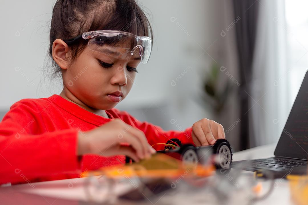 Os alunos da Ásia aprendem em casa na codificação de carros robóticos e cabos de placas eletrônicas em STEM, STEAM, código de computador de tecnologia de ciência de engenharia matemática em robótica para o conceito de crianças.