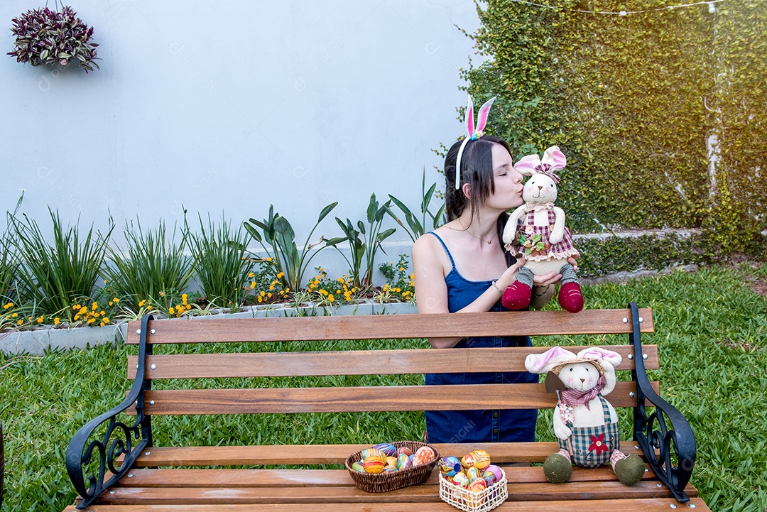Mulher com orelhas de coelhinho da páscoa mostrando ovos de páscoa
