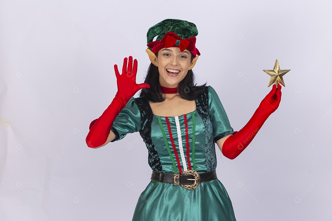 Linda jovem com fantasia de duende em fundo branco