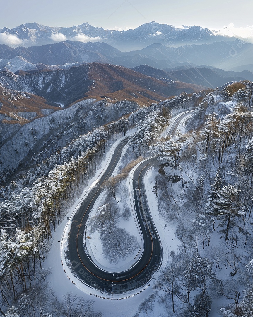 Vista aérea de uma estrada sinuosa nas montanhas com neve