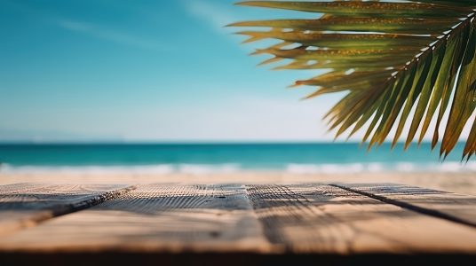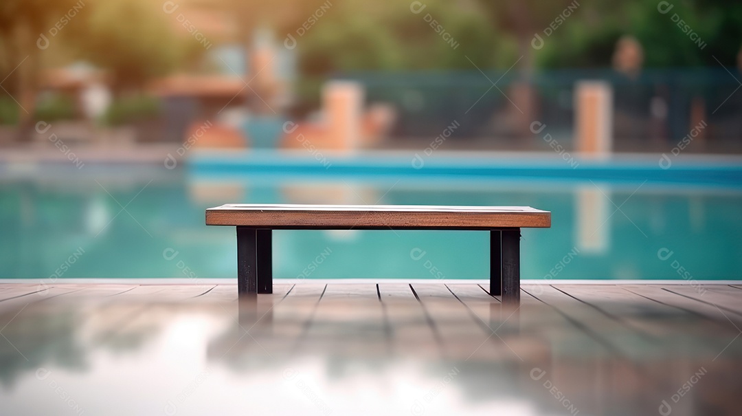 Mesa de madeira vazia fundo desfocado.
