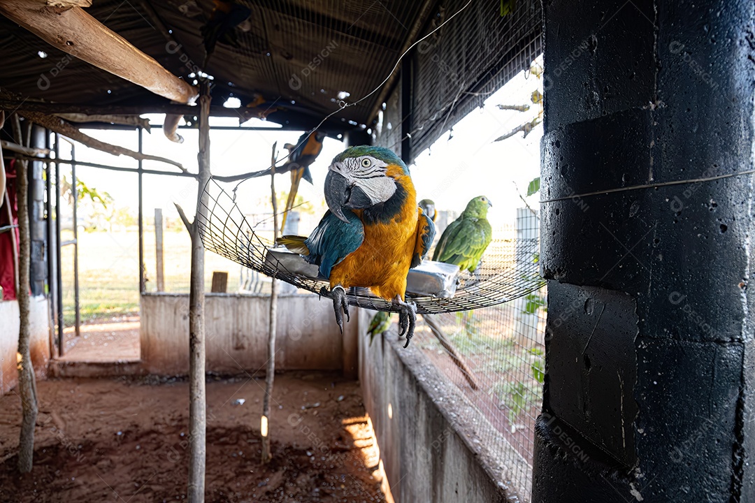 Arara-azul-e-amarela adulta da espécie Ara ararauna resgatada em recuperação para reintrodução gratuita