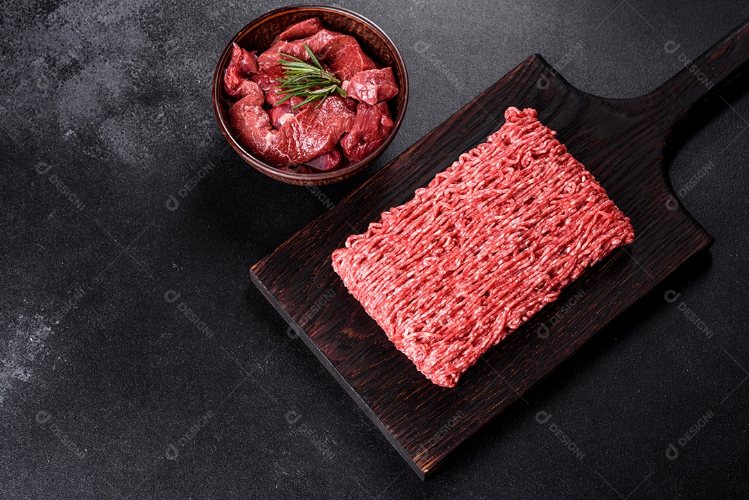 Carne crua fresca picada em um fundo escuro. Preparação para cozinh...