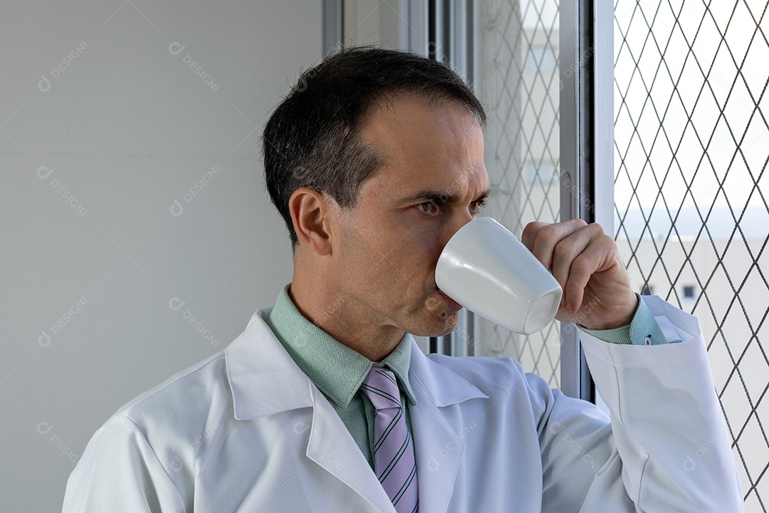Médico de 44 anos, sorridente, de jaleco branco e gravata